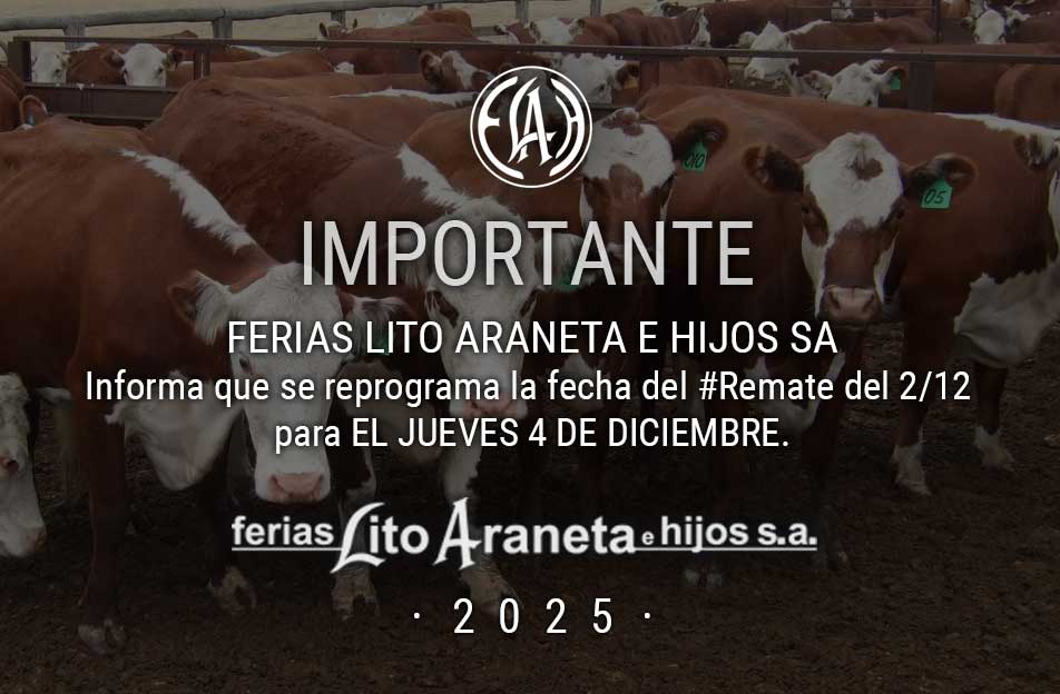 En 1977, nacía la Feria fundada por Abel Roberto Araneta “Lito” y Miguel Angel, que inició actividades con yeguarizos, porcinos, lanares, aves y vacunos. Continuando con la tradición familiar y la trayectoria de siempre bajo la dirección de Abel Roberto Araneta e Hijos Ferias “Lito” se caracteriza por la seriedad y responsabilidad que imprime nuestra experiencia en remates. Ubicada en Carmen de Areco, con gran trayectoria en el mercado de remates, la Feria trabaja junto a un equipo de personas que brindan soluciones a nuestros clientes en cada área. Crecimos comercial & tecnológicamente, manteniéndonos a la par de las exigencias del mundo moderno, para permanecer a la vanguardia del campo.